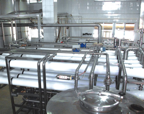 3、节能降耗,大大降低煤耗(例如:一台明胶浓缩膜设备,在实际运行中,平均每脱出一吨水需耗电3KW左右,无需其它能源,而且稀胶中75~80%的水份可通过膜快速去除,而使用常规的三效热浓缩脱出一吨水约需120kg煤,同时还要耗电,因而膜浓缩的节能效果相当突出)。